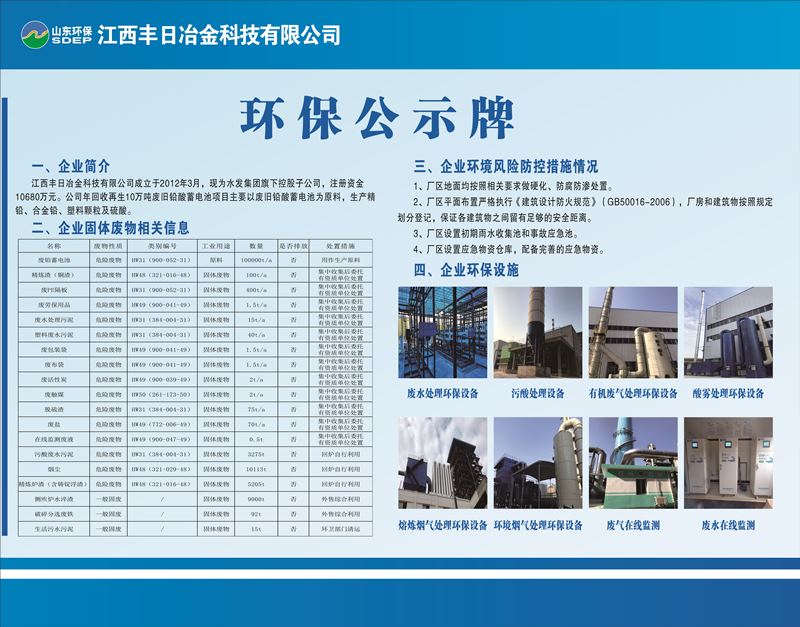 江西豐日冶金科技有限公司成立于2012年3月,注冊資金15000萬元,現為山東環保集團旗下控股子公司,落戶于江西省宜春市袁州醫藥工業園。公司年回收再生十萬噸廢舊鉛酸蓄電池項目占地62.41畝,總建筑面積42180㎡,總投資3.5億元,于2020年5月份投入生產,自生產以來運行穩定,年產值達10億元以上,年納稅1億元以上。